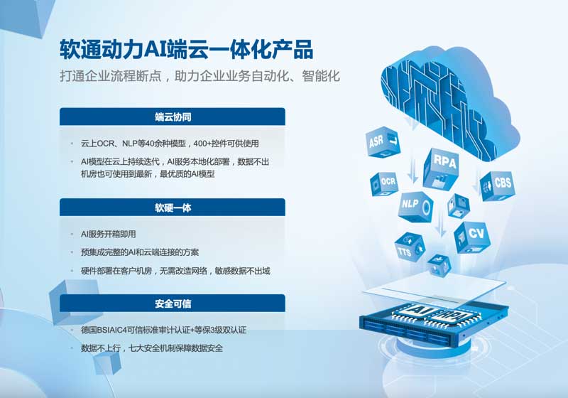 软通动力AI边云服务器组合了机器人流程自动化 (RPA) 和人工智能 (AI) 技术,预置了AI、RPA和低代码能力,支持在不同系统之间进行数据的录入、提取和验证等操作。通过端云协同框架将AI服务下发到客户端侧服务器之后,可以在客户环境中独立运行,数据不出机房也可高效迭代AI模型,帮助打通企业流程断点,助力企业业务自动化和智能化。