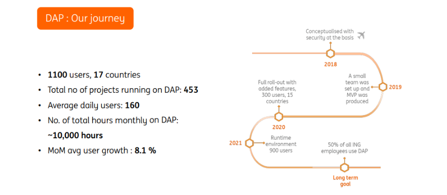 在银行行业有许多法规和限制,如:监管要求在全球范围内各不相同、数据孤岛-全局和本地限制、数据安全、合规创新等,想要快速引入新技术不是一件容易的事情,为此,ING布局符合自身产业的DAP平台(Data Analytics Platform),为全球50%的ING员工提供安全的、自助的端到端分析能力,帮助员工在数据平台之上构建并解决业务问题。