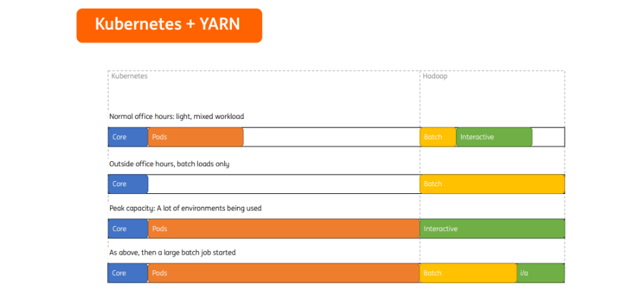 Kubernetes和YARN共同工作时,由于Kubernetes和Hadoop资源是静态划分的,在正常办公时间,Hadoop应用和Kubernetes各自使用自身分配资源,即便spark任务压力大也无法借用更多资源。夜晚时间,集群中仅有批处理任务,Kubernetes资源全部空闲,却无法分配给Hadoop进行有效利用,对于调度平台来讲,这不是一种最佳的资源分配方式。