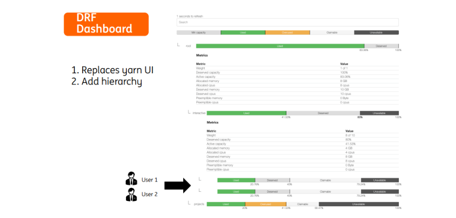 我们根据Volcano的监控数据做了一个drf调度的仪表盘,在不同层次显示更细粒度的调度信息。在业务集群中,我们有一个队列存放交互式用户的任务,另有队列存放平台运行的所有重大项目的计算任务,我们可以为重大项目队列提供一定的资源倾斜,但是此时对交互式用户的任务将不会太友好。