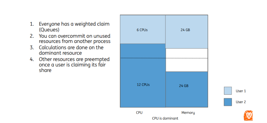 比如集群资源总量为CPU:18C,Memory:72GB,两个用户分别是User1和User2,每个User分配1个队列,在提交作业时会根据主导资源计算job的调度优先级。