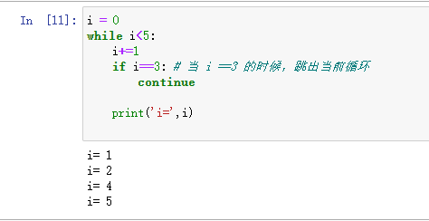 代码运行结果如下所示,其输出内容跳过了 i = 3,然后循环继续运行,这就是 continue 的价值。