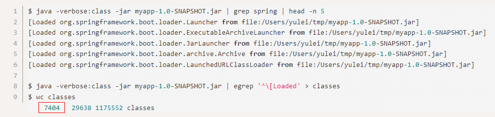 • 框架复杂:Spring作为一个企业级的框架,为了支持广泛的应用需求,存在大量的可配置和初始化逻辑,并通过复杂的设计模式来支撑这种灵活性。例如,一个spring-boot-web的hello world,依赖的class文件就多达7404个,见图2;