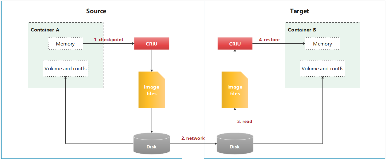 1. 在Source机器上启动微服务,通过健康检查和初始化调用后,进行Checkpoint,停止服务,生成进程快照信息;