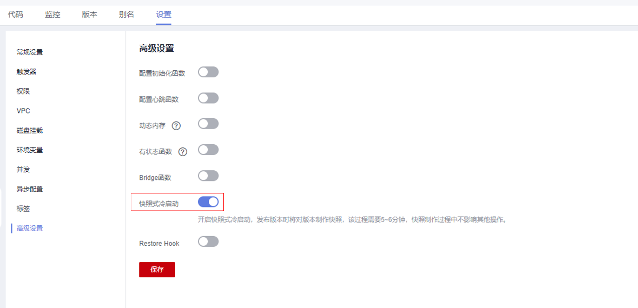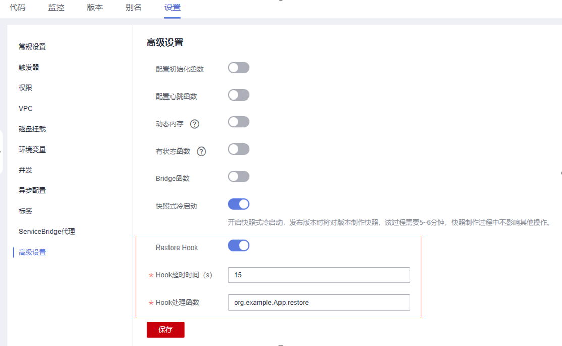 2. (可选)配置Restore Hook,并在函数代码中实现对应的Hook逻辑