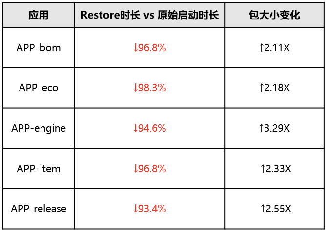 • Restore 耗时是秒级,相当于将数十秒完整的初始化时间(在图 1 的示例中)缩短至秒级 Restore 耗时,启动性能提升了一个数量级。