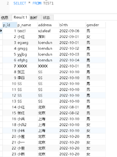 String sql ="SELECT p_id,p_name,address,birth,gender FROM TEST1 ";