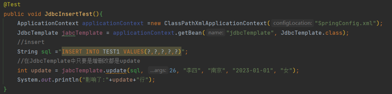int update = jabcTemplate.update(sql, 26, "李四", "南京", "2023-01-01", "女");
