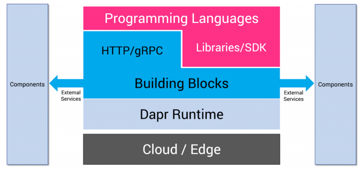 Dapr 的体系结构与 COM/DCOM 和 EJB 为在 Windows 和 Java 上运行的分布式应用程序提供管道的方式类似,Dapr 基于容器化、云原生、微服务的应用程序所需的繁重工作。Dapr 有三大元素:运行时、 服务构建块和SDK