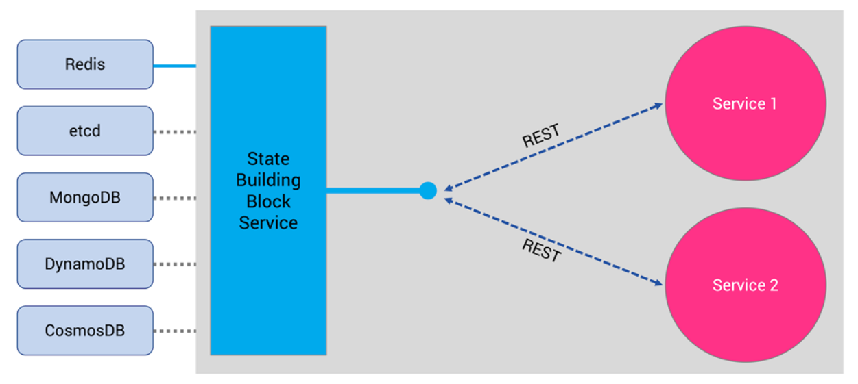 上图是状态构建基块组件封装构建基块 API 的实现。状态构建基块的实现可能包括 Redis、etcd、MongoDB、Amazon DynamoDB 和 Azure CosmosDB。许多组件是可插拔的,因此一个实现可以很容易地换换到另一个实现。