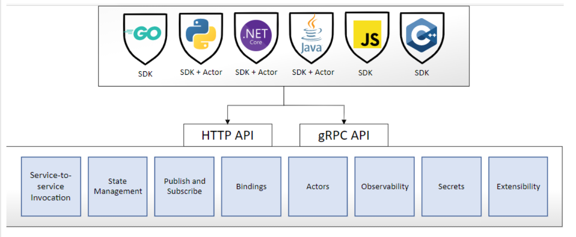 为了使不同语言使用 Dapr 更自然,它还包括用于 Go、Java、JavaScript、.NET 和 Python 的语言特定 SDK。这些 SDK 通过语言封装的 API 而不是调用标准 http/gRPC API 公开 Dapr 构建基块中的功能,例如保存状态、发布事件或创建Actor。这使开发人员能够用自己选择的语言编写无状态和有状态函数和参Actor的组合。