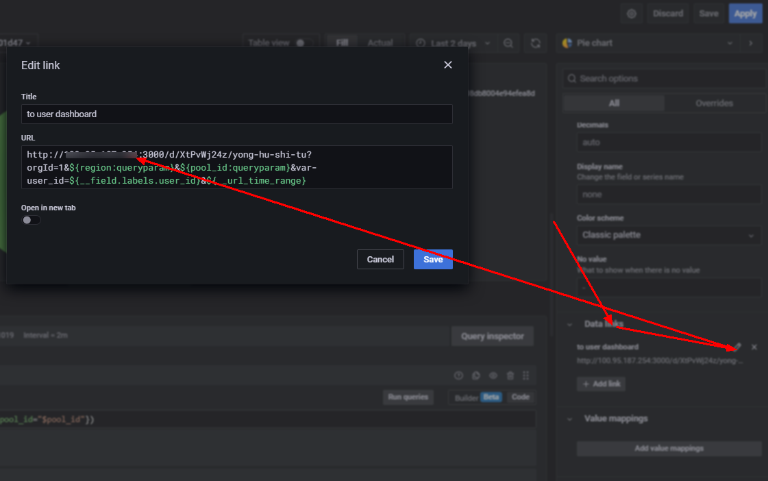 “Data Links”的url需要根据实际安装配置来设置。可能需要修改的点包括:EIP(访问链接),Dashboard ID(若进行了自定义)。