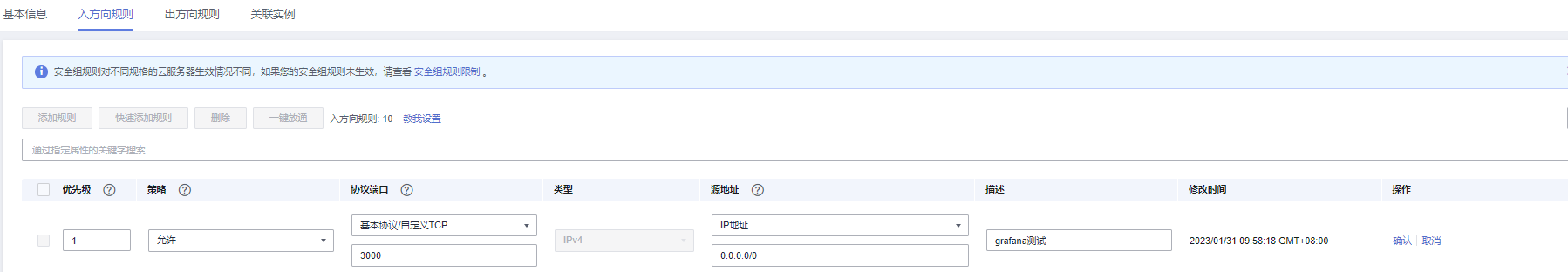 确保ECS绑定了弹性IP,且对应安全组配置正确(入方向放开TCP协议的3000端口,出方向全部放通)。如: