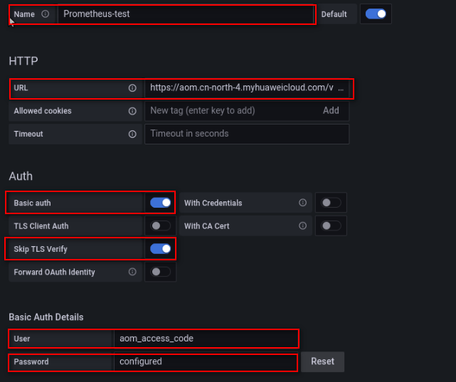 在Grafana中需要配置数据源URL,URL的组成是:https://{Endpoint}/v1/{project_id}