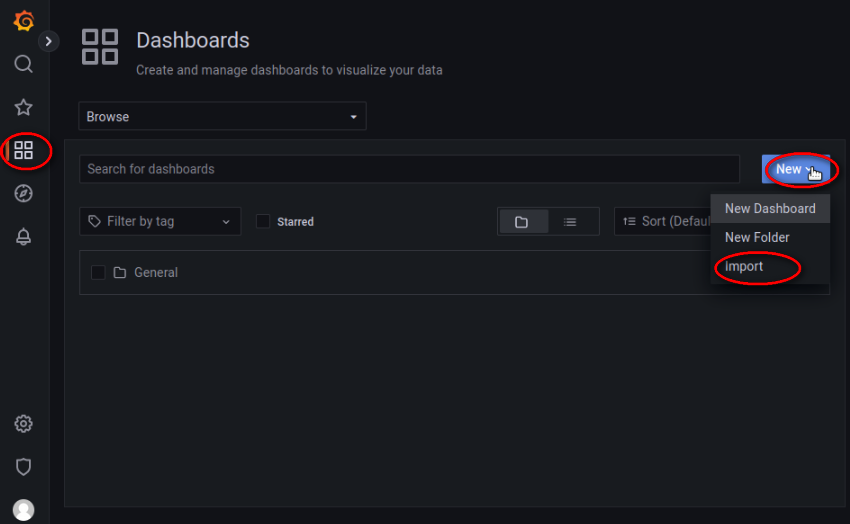 1、 打开“DashBoards”,点击“New”,选择“Import”