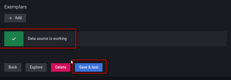 e. 配置完成后,点击下方的“Save & test”,展示“Data source is working”代表配置数据源成功。