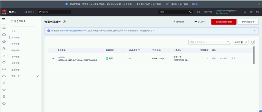 登录华为云控制台,鼠标移动到云桌面浏览器页面中左侧菜单栏,点击服务列表->“大数据”->“数据仓库服务GaussDB(DWS)”,进入左侧栏“数据仓库服务”页面。
