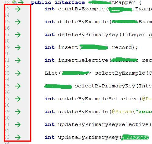 安装过Free Mybatis插件之后,会在Mapper接口文件中出现向右指的箭头,而在对应的xml文件中会出现向左指的箭头,遥相呼应。如图所示:
