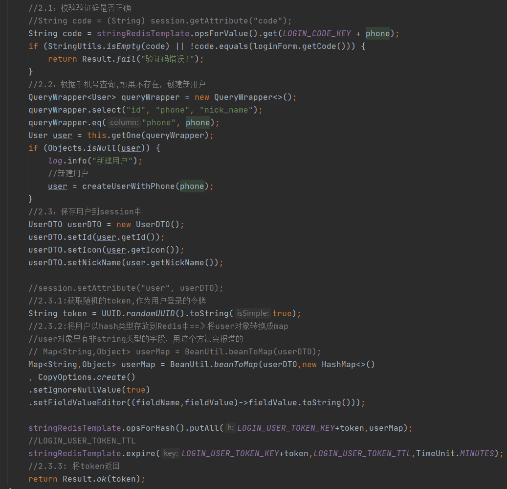 2:用户登录的时候,校验验证码及将用户存放返回token