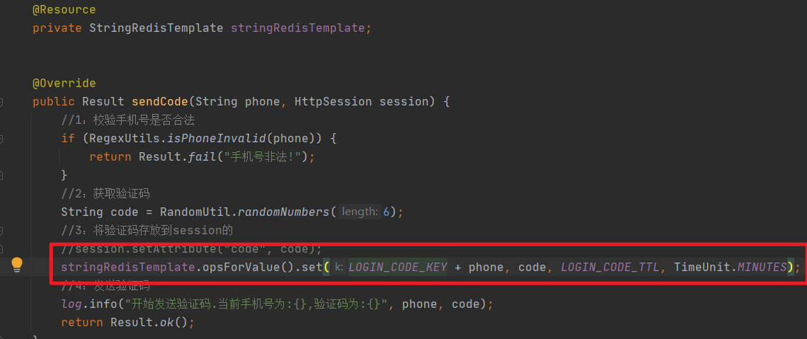 stringRedisTemplate.opsForValue().set(LOGIN_CODE_KEY + phone, code, LOGIN_CODE_TTL, TimeUnit.MINUTES);