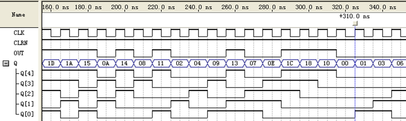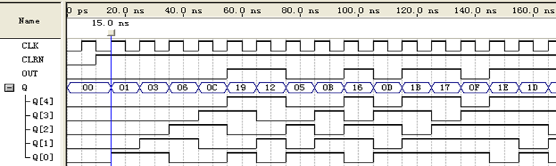 分析该电路得到如图所示的仿真波形图,其中任何一级触发器(通常为末级)的输出都是一个周期序列(或者称为m序列),但各个输出端的m序列的初始相位不同。m序列的周期不仅与移位寄存器的级数有关,而且与线性反馈逻辑和初始状态有关。