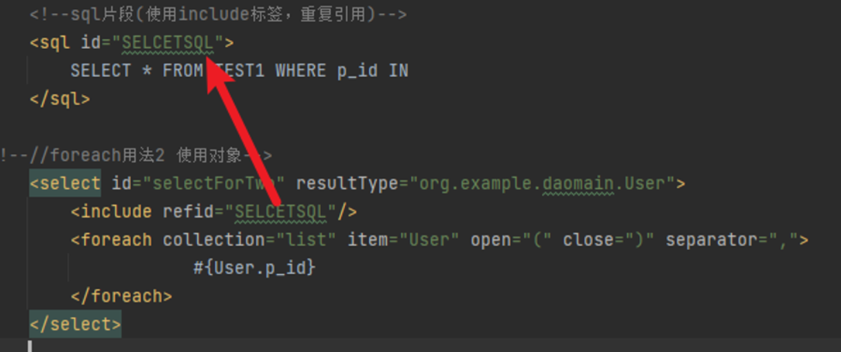 定义:<sql id=”自定义名称唯一”>sql语句</sql>