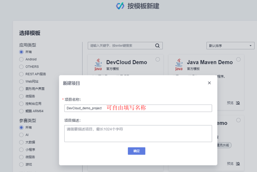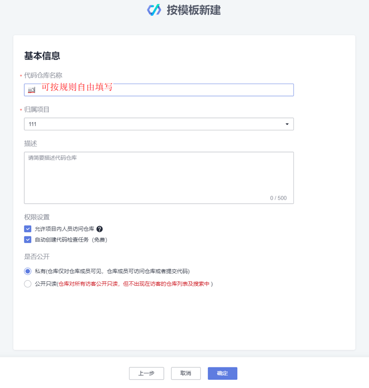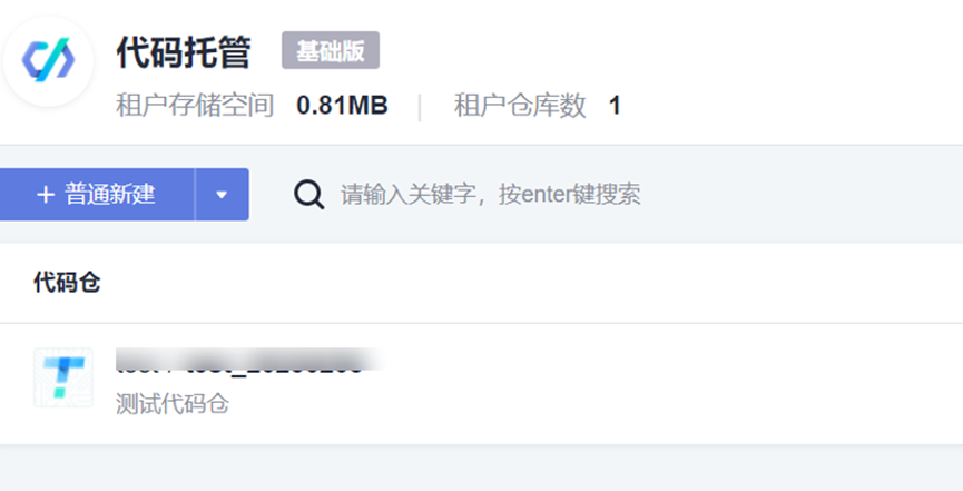 3、代码仓名称可按照规则自由填写,其他默认即可,点击“确认”,可查看已创建的代码仓