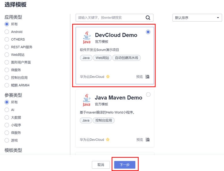 2、任意选择一个模板,点击“下一步”按照规则自由填写项目名称信息