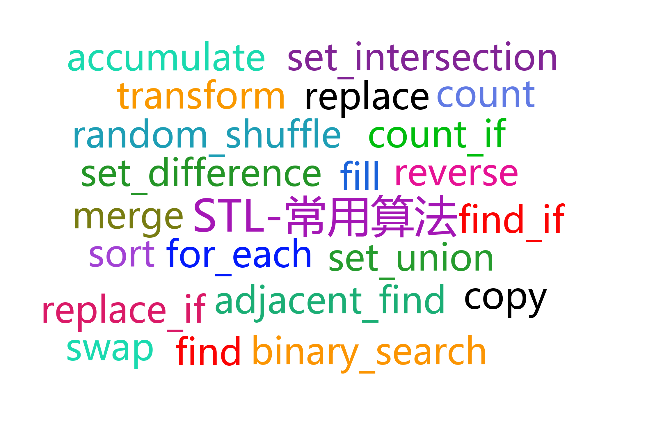 <algorithm>,<functional>,<numeric>组成 - <algorithm>是所有STL头文件中最大的一个,范围涉及到比较、交换、查找、遍历、复制、删除等