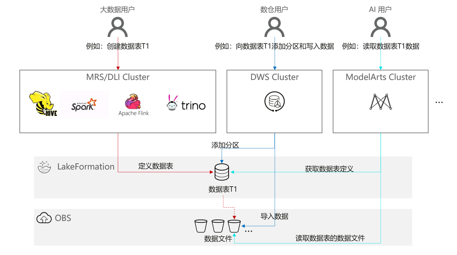 以数智融合场景为例,当大数据用户在MRS中创建了表T1时, 数仓用户可通过lakeformation观察到表T1的元数据,并通过其他MRS集群中写入正确的数据内容。