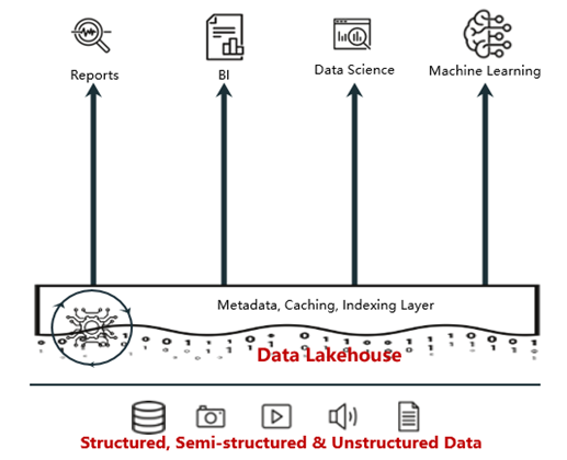 为了解决上述数据湖的相关挑战,2019年左右,业界开始出现一种新的数据架构,叫做DataLakehouse(湖仓一体),它同时吸收了数据仓库和数据湖的优势,能够在存算分离的基础上,构建统一元数据层,上层服务通过统一元数据层,便捷高效地共享数据和权限管理。因此数据分析师和数据科学家可以在同一个数据存储中对数据进行操作,为公司进行数据治理带来更多的便利性。