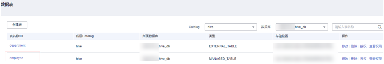 反过来,用户通过MRS的hive客户端创建一个employe表后,可以在LakeFormation中看到该元数据信息。