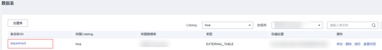 当用户在LakeFormation中针对MRS集群的catalog建立了department表后