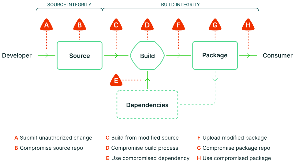 下图描述了软件供应链中已知的攻击点。更多详细描述,可参考https://slsa.dev/ 。