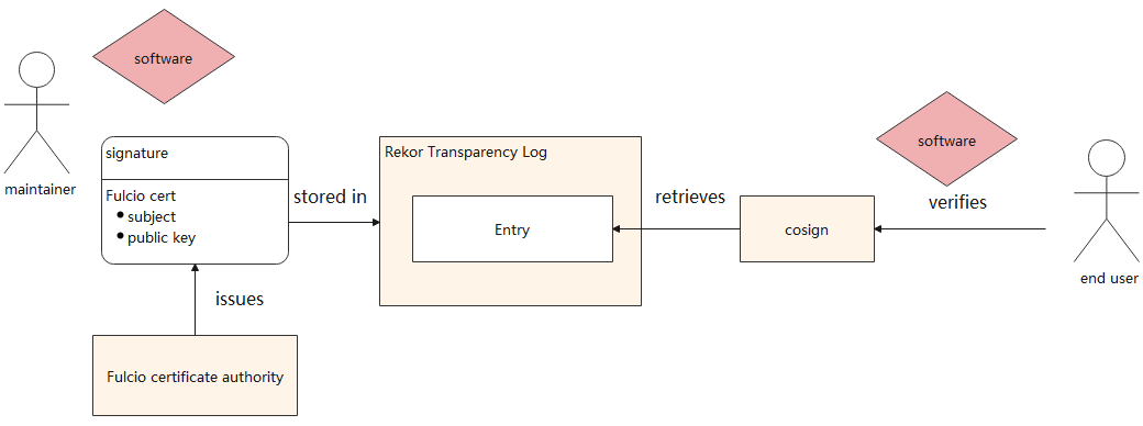 使用 OIDC,工作流向 Sigstore 的 Fulcio 根证书颁发机构证明其身份,后者充当外部验证服务。 Fulcio 签署了一份短期证书,证明运行器中生成的临时签名密钥并将其与工作负载身份相关联。签署出处的记录保存在 Sigstore 的透明日志 Rekor 中。用户可以使用签名证书作为信任方来验证来源是否经过身份验证且不可伪造;它必须是在受信任的构建器中创建的。流程图如下所示。