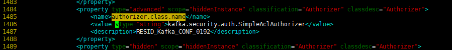 7. 搜索authorizer.class.name,将value一行改为<value vType="string"> kafka.security.authorizer.AclAuthorizer </value>