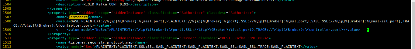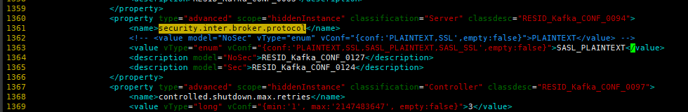 5. 搜索security.inter.broker.protocol,修改1363,将model="Sec"删除,将1362行注释