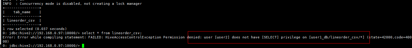 Error while compiling statement: FAILED: HiveAccessControlException Permission denied: user [user1] does not have [WRITE] privilege on [obs://ly-pfs/city_hive/user1.db]