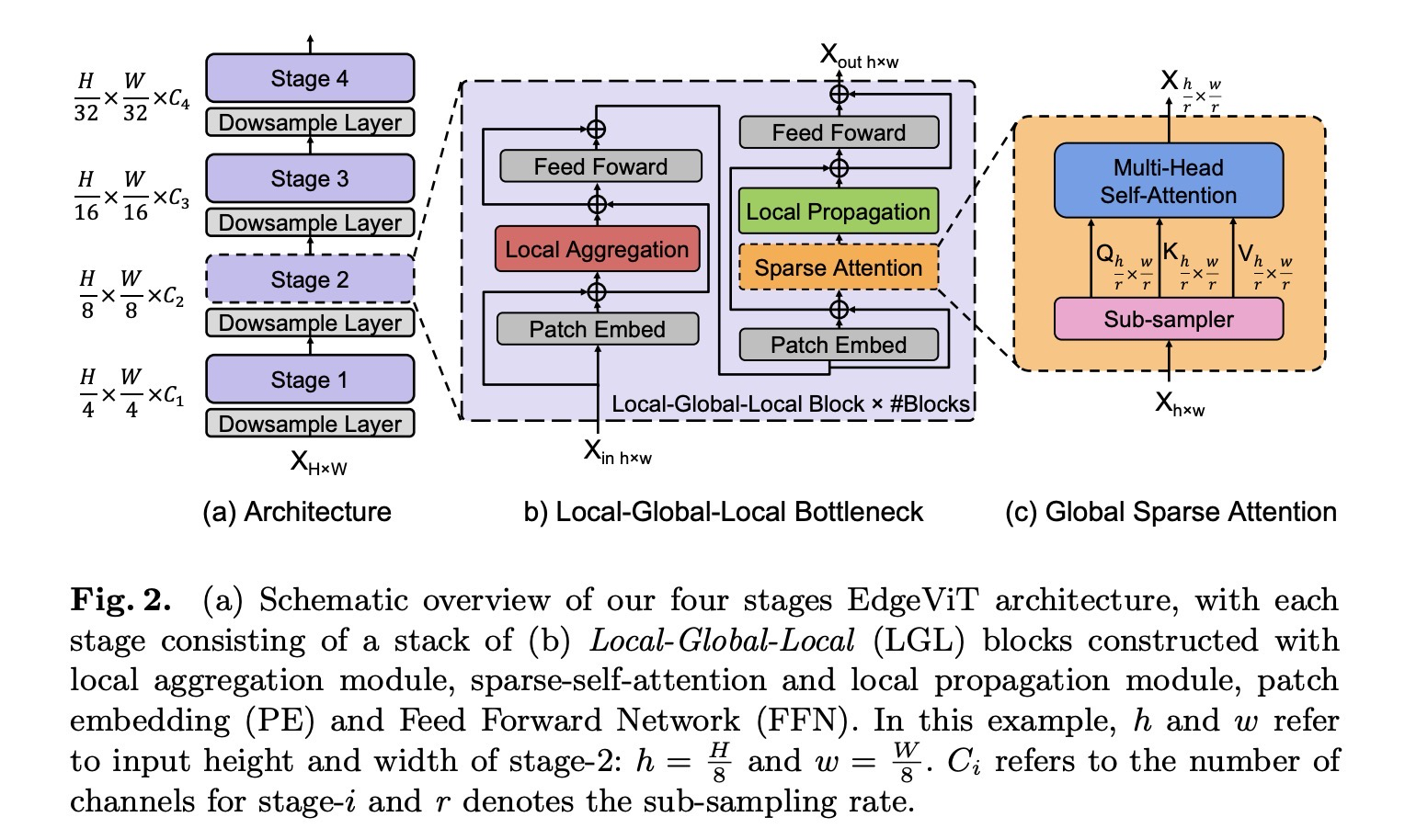 在这项工作中,作者深入到Transformer Block,并引入了一个比较划算的Bottlneck,Local-Global-Local(LGL)(图2(b))。LGL通过一个稀疏注意力模块进一步减少了Self-attention的开销(图2©),实现了更好的准确性-延迟平衡。
