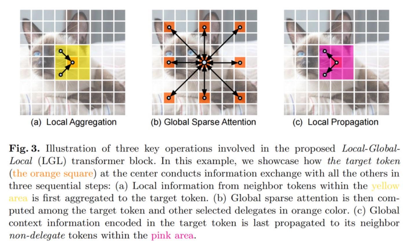 - Local propagation:将委托学习到的全局上下文信息扩散到具有相同窗口的非代表Token。