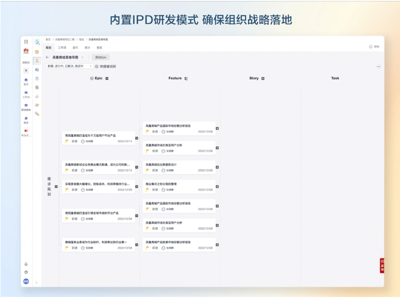 需求是产品开发的驱动力,一个成功的产品往往需要花费40%的时间来管理需求,管好需求就是保障组织战略落地。华为云CodeArts Req内置了华为IPD需求管理模板,通过Epic、Feature来管理组织战略规划,以脑图、甘特图形式对战略进行逐层分解,确保组织战略落地。
