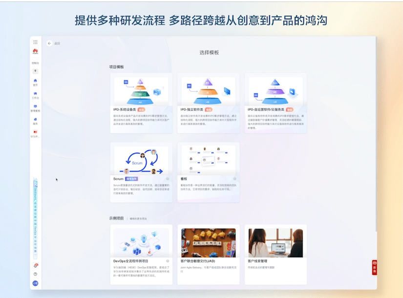 针对研发模式的差异,华为云CodeArts Req提供了丰富的项目模板,支持IPD、DevOps、精益等多种场景化研发模型,用户可以根据企业规模、业务需求、使用场景选择不同的项目模板,让创意更快变成产品。