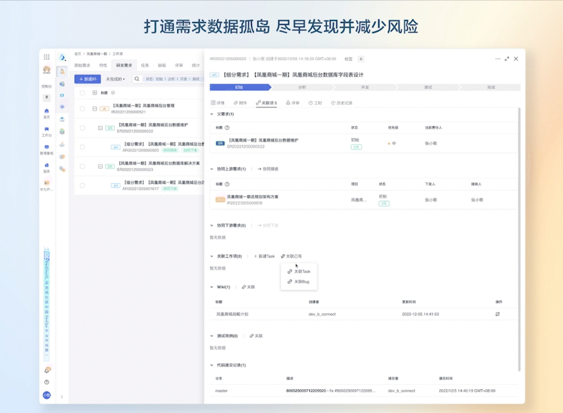 - 支持需求多级分解,需求能与测试管理系统的测试用例建立关联关系,实现需求到用例的双向可追溯,需求能自动进入迭代模块进行迭代计划的制定、任务下发和需求验收状态管理;