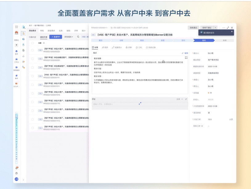 华为云CodeArts Req打破了传统需求管理工具仅在研发阶段发挥作用的限制,将客户与市场需求也同步覆盖,提供了完整的客户需求采集、价值需求决策、交付与验收流程,让需求进展和动态客户实时透明,市场需求流动提速70%。