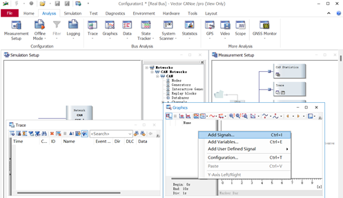 然后点击Aalysis>Trace and Graphics,进行测试数据记录收集,还可以在Graphics面板里鼠标右击进行signals 的添加,对测试结果进行核对校验(如图1-4所示)。