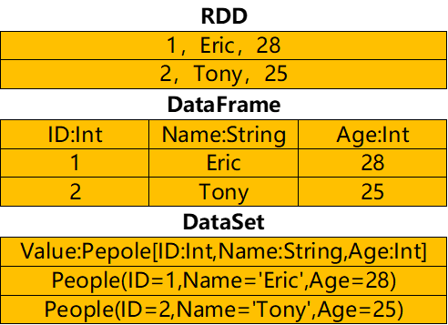 RDD、DataFrame及DataSet的存储结构的差异大致如下: