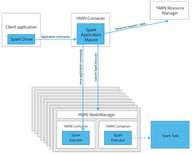 - Driver进程运行在客户端内。Master以及Executor进程运行在Yarn Container上。