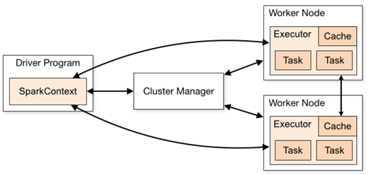 - Cluster Manager:集群资源管理中间件,支持Spark自带的Standalone、Yarn等管理器。