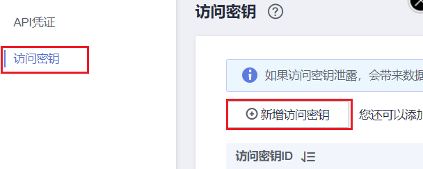 在“我的凭证”页面,然后依次点击【访问密钥】、【新增访问密钥】。