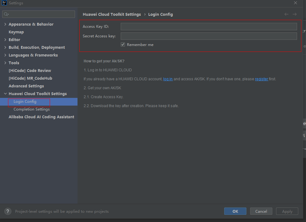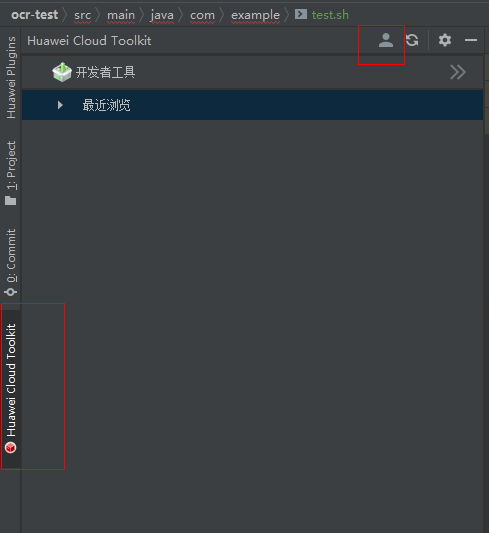 进入IDEA页面,打开左侧的Huawei Cloud Toolkit窗口,点击用户登录按钮,这时右下角弹出“Huawei Cloud Toolkit:Login Failed The AK/SK is empty”,点击下面的“Set your AK/SK”